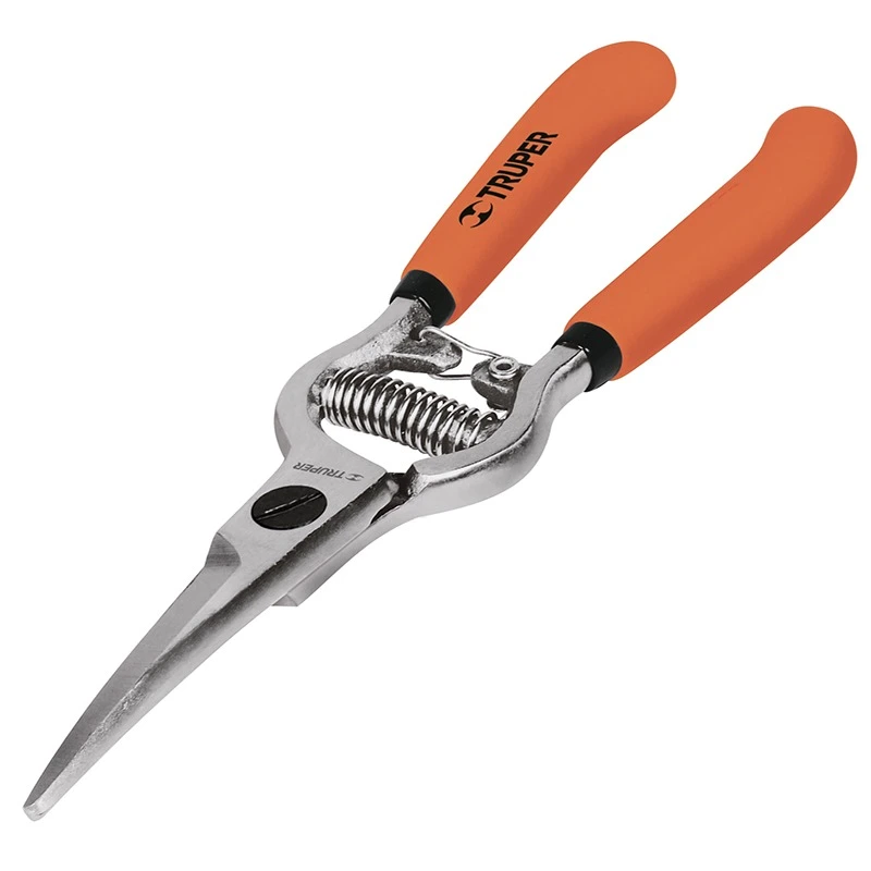 Секатор Т-24, гнутий, PVC виноградний 200мм. Спеціальний секатор з вузькими лезами підходить для роботи не тільки з виноградом, а також з квітами, малиною та іншими кущовими рослинами. Загартоване лезо, зручні ручки, що мають гумоване покриття для надійного тримання в руці.