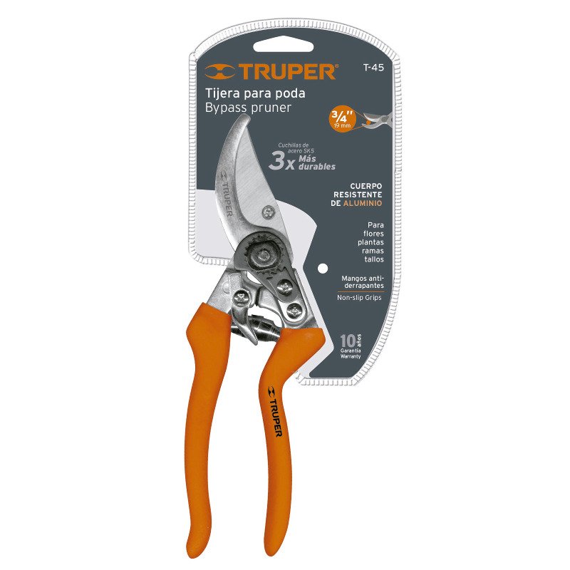 Секатор площинний класичної конструкції Т-45, 200мм. Лезо виготовлене з високоякісної японської сталі SK5. Надійний, зручний замок, що легко відкривається однією рукою та виключає випадкову зміну його положення. Ергономічні ручки, виготовлені з надміцного алюмінію, з нейлоновим покриттям під зручний хват долонею. Діаметр максимального різу 20 мм.