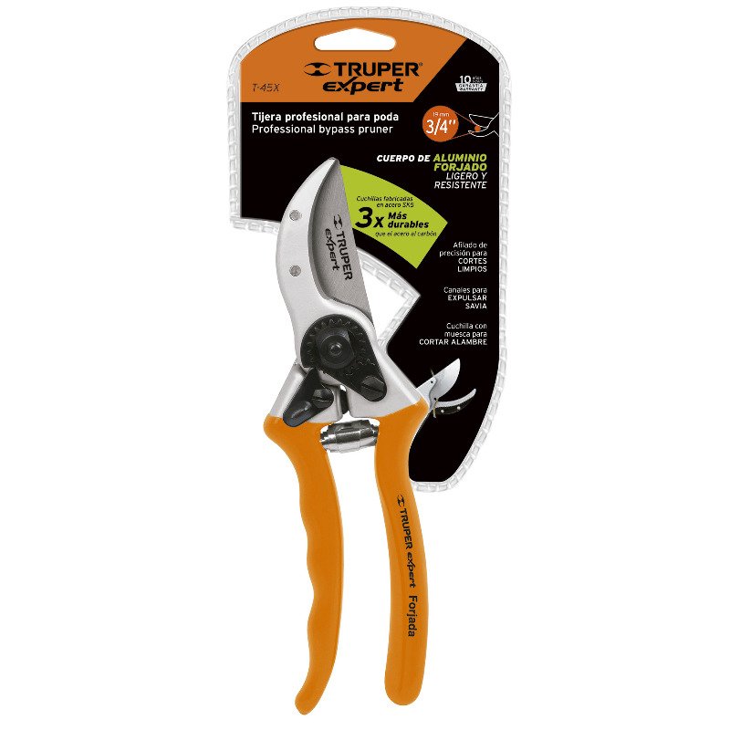 Секатор Профі, площинний класичної конструкції Т-45х, 200мм. Лезо виготовлене з високоякісної японської сталі SK5. Надійний, зручний замок, що легко відкривається однією рукою та виключає випадкову зміну його положення. Ергономічні ручки, виготовлені з надміцного алюмінію, покриття з ПВХ, під зручний хват долонею. Має спеціальний виріз на лезі для перекушування дроту. Діаметр максимального різу 20 мм.