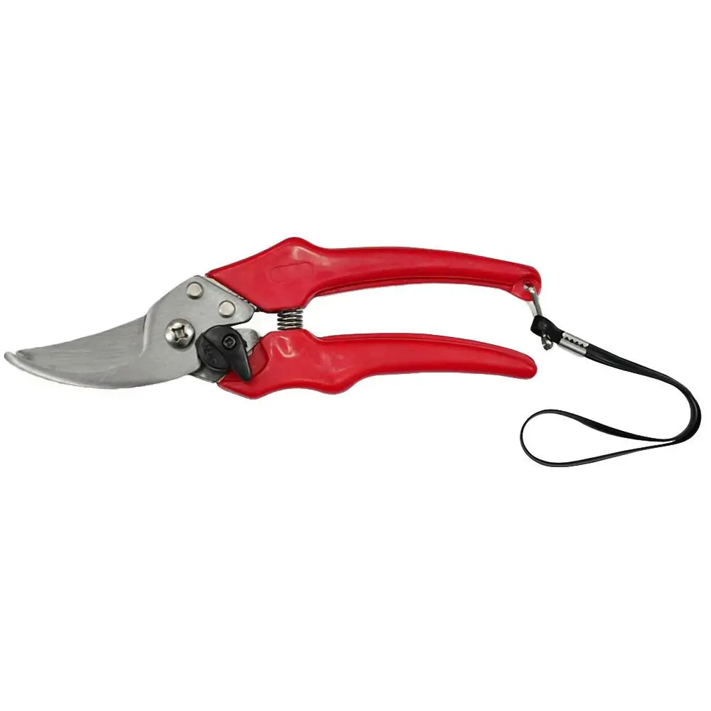 Небольшой и прочный ручной обводной секатор с верхним рабочим лезвием, общей длиной 195 мм, предназначен для работы с комнатными растениями, обрезки черенков, цветов, сбора урожая фруктов и винограда, подрезки тонких живых ветвей деревьев и кустов в саду. Лезвия изготовлены из стали без покрытия, косой срез, диаметр среза до 15 мм, удобный боковой пластиковый фиксатор, проволочная пружина, пластиковая облегченная рукоятка для небольшого объема работ в саду. Возможно работать правой и левой рукой. Дополнительный ремешок для фиксации секатора на запястье.