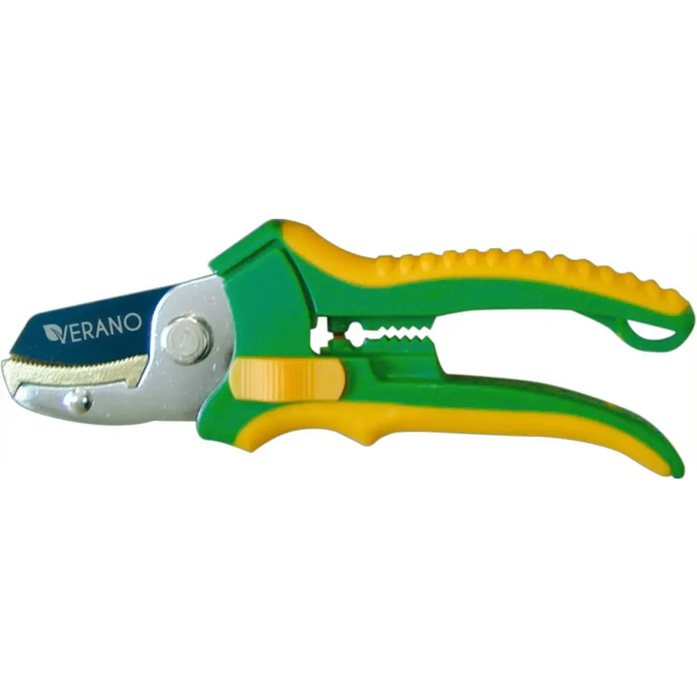 Мощный секатор, верхнее режущее лезвие из высокоуглеродистой стали SK5 с PTFE покрытием (которое предотвращает залипание ветвей, прилипание сока от веток, а также пыли и грязи, упрощает процесс работы и очистки инструмента после работы), нижнее лезвие с дополнительной зубчатой наковальней. Прямой срез до 19 мм. Рукоятки двухкомпонентные PP + TPR, усиленные, не скользят. Прочный безопасный сдвижной пластиковый фиксатор открытия лезвий, под большой палец. Упор между рукоятками. Отверстие для ремешка. Инструмент могут использовать и правши, и левши. Секатор предназначен для профессиональной резки твердых сухих растений при санитарной обработке сада.