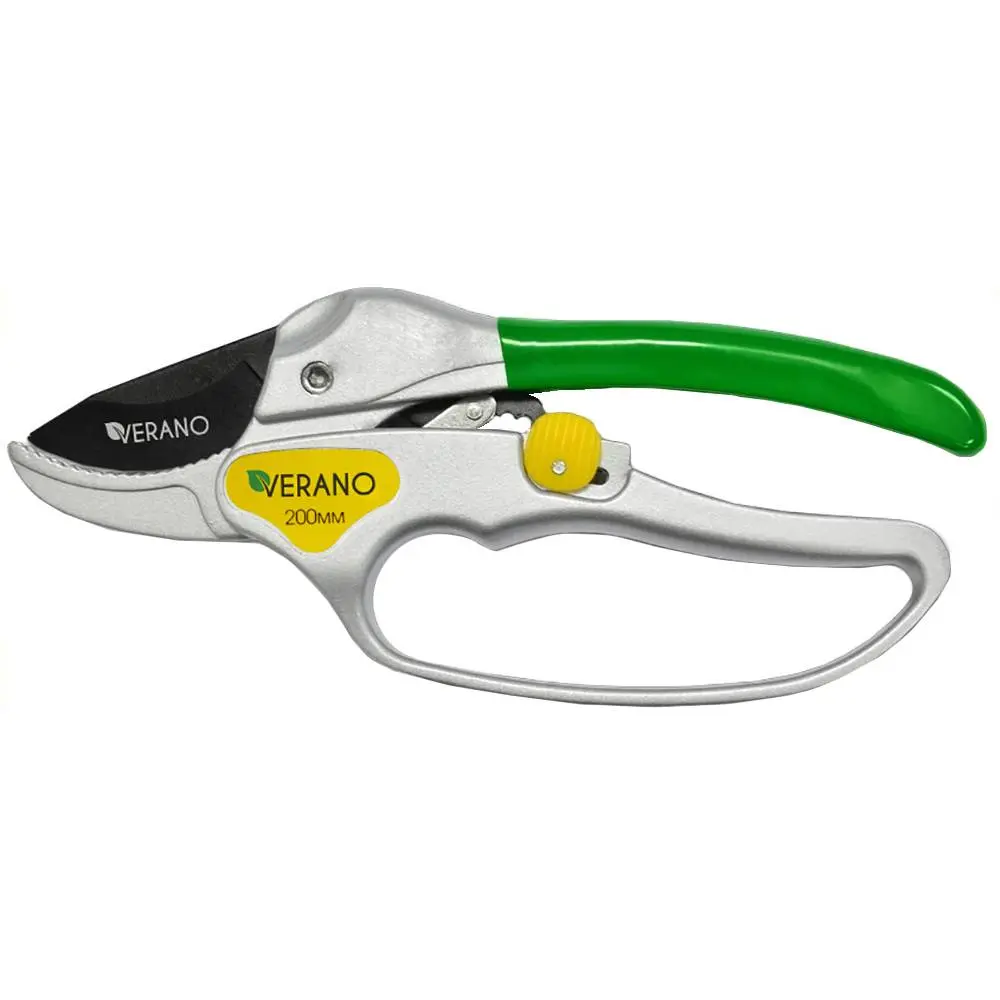 Секатор універсальний довжиною 200 мм застосовується для товстої живої та сухої деревини. Верхнє ріжуче лезо з високовуглецевої сталі з PTFE покриттям (проти налипання). Нижнє зубчасте лезо-упор повністю виключає сковзання гілки при різанні. Зріз прямий до 25 мм. Надійний фіксатор. Храповий механізм різу. Рукоятка має закриту форму для захисту руки. Корпус виготовлений з алюмінієвого сплаву і пофарбований в колір металлу титан. Рукоятки зручні, ергономічні, не ковзають, інструмент можуть використовувати і правші, і лівші. Храповий механізм не використовується для різання молодих гілок, тому що при роботі з молодою порослю механізм перевантажує кисть руки (секатор може використовуватись без задіяння храпового механізму для різання тонких гілок за 1 раз).