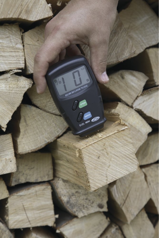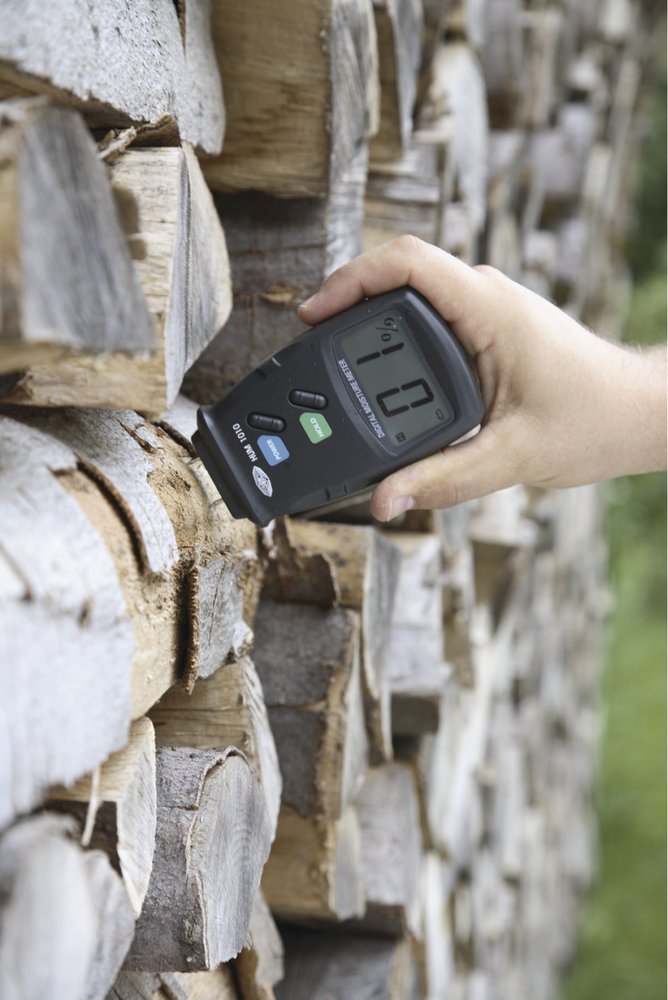 - два контакта электрода необходимо вдавить в поверхность древесины, и на ЖК-дисплее отобразится процент оставшейся влажности