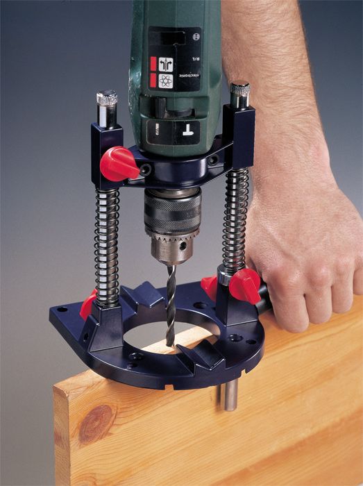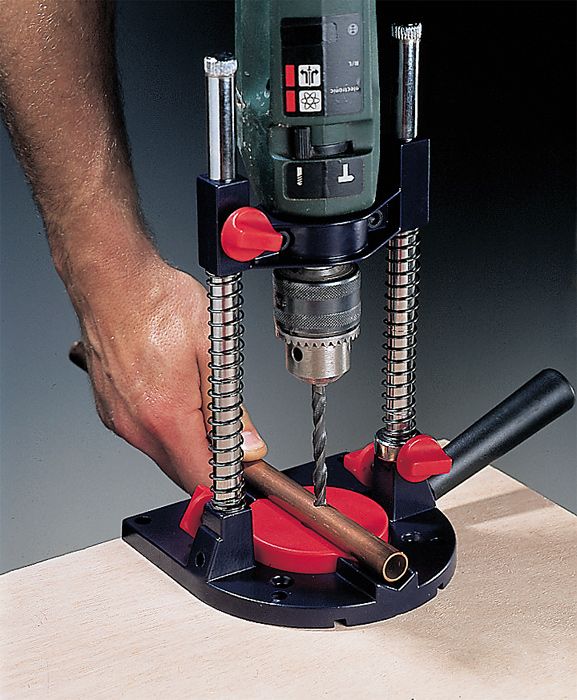 Сверлильная стойка, для электродрелей с зажимной еврошейкой Ø 43 мм, поворотная двухстоечная направляющая 90-45°, для точного сверления по горизонтали, вертикали и под углом, бесступенчатая настройка глубины, прямой упор для серийного сверления отверстий по одной линии, встроенный V-образный паз для надёжного крепления круглых материалов.