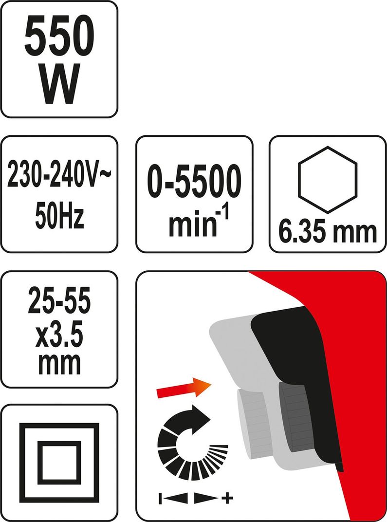 YATO Шурупокрут для шурупів до г/к плит мережевий: 550 Вт, з обоймою для шуруп: Ø= 3,5мм, l= 22-55мм