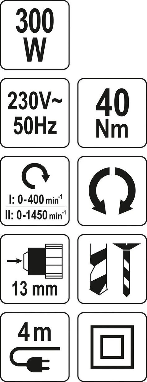 Универсальная дрель-шуруповерт с муфтой мощностью 300 Вт, рекомендуется для сверления дерева и металла, а также для заворачивания и извлечения болтов и шурупов. Электропитание обеспечивает постоянную мощность во время работы, а высокий крутящий момент позволяет работать с кольцевыми пилами, винтами и столярными изделиями.