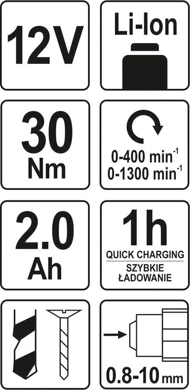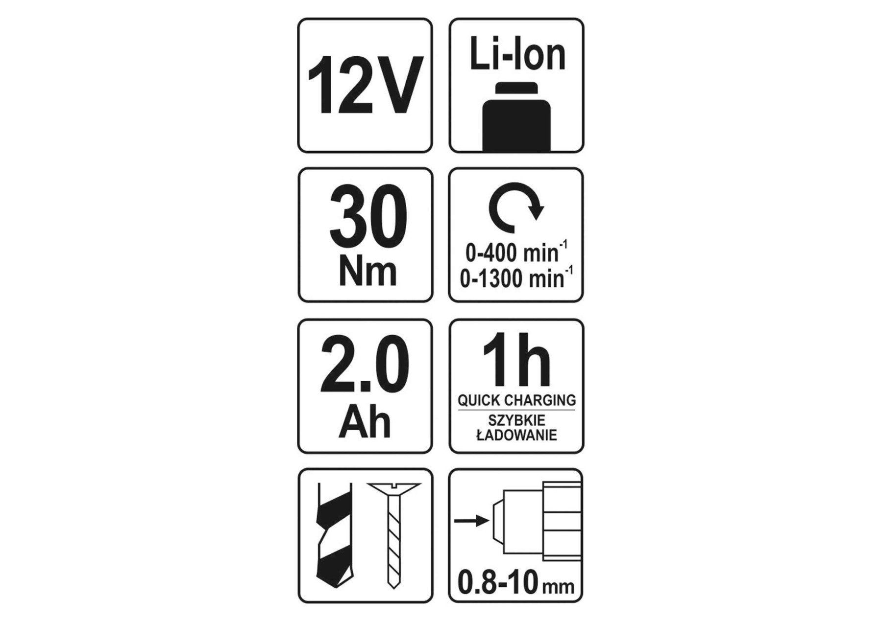 YATO Шуруповерт компактний акумуляторний : Li-Ion 12 В, 2 Агод, крутн.мом.- 30 Нм, патрон Ø≤10 мм