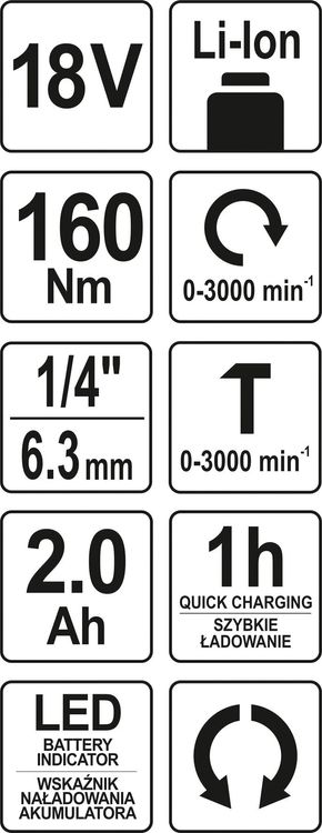 YATO Шуруповерт ударний акумул. Li-Ion: V= 18 В, крутн.мом.- 160 Нм, 2 Агод, патрон з квадр. 1/4"