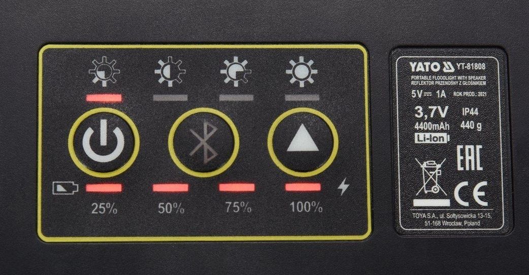 Світильник акумуляторний Yato 3 в 1 - чудова ідея для людей, які люблять слухати музику під час роботи чи відпочинку. Два потужні світлодіоди COB LED забезпечують освітлення 2000 lm, а шість режимів роботи дозволяють налаштувати їх відповідно до поточних потреб. Літій-іонний акумулятор ємністю 4400 mAh гарантує від 2,5 до 12 годин роботи та можливість використання функції powerbank. Пристрій можна підключити, наприклад, до телефону за допомогою bluetooth , а потім відтворювати улюблену музику завдяки високоякісному динаміку