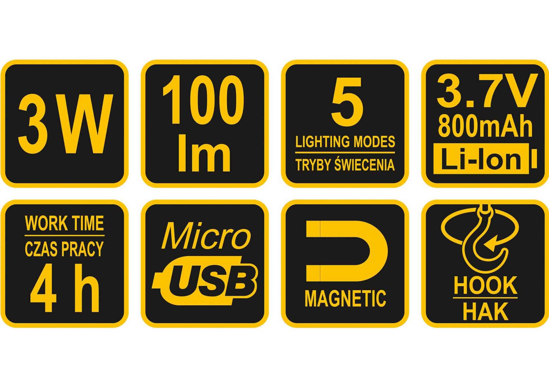Ліхтар COB LED акумуляторний VOREL : діодний (3Вт) 100Lm, Li-Ion 3.7 В, 800 A/Год, 5 режимів [12/48]