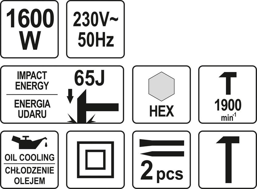 YATO Молот відбійний мережевий : 230V, 1600 Вт, F= 65 Дж з оливним охолодженням; + 2 піки