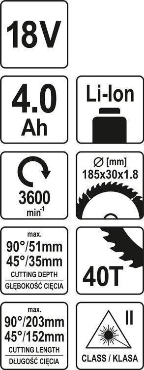 YATO Пила торцьовальна акумуляторна : Li-Ion 18 В, 4 АГод, диск Ø=185/30 мм, різ 0°/45°-51/35мм