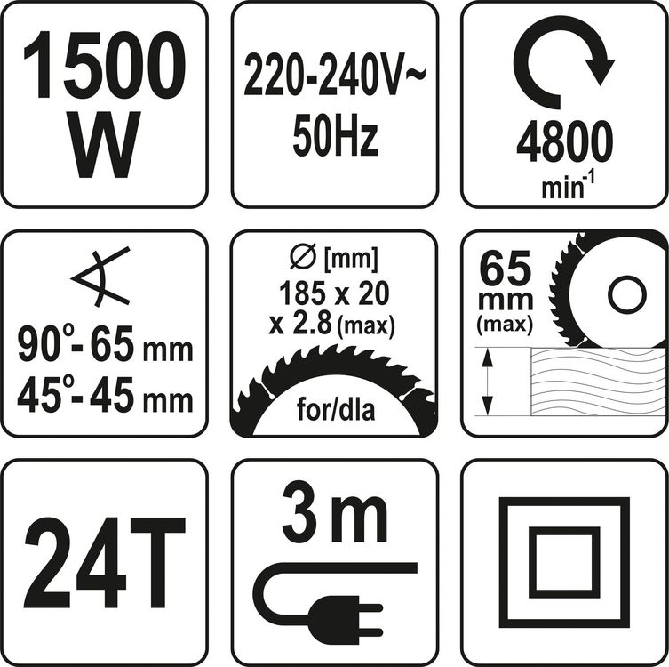 YATO Пила дискова ручна мережева : P= 1.5 кВт, диск Ø=185x20x2.8 мм, кут 0-45°, гл.≤ 65мм