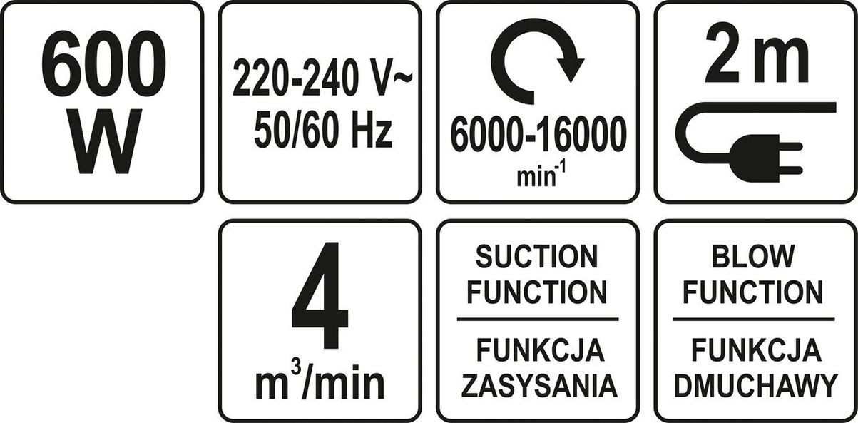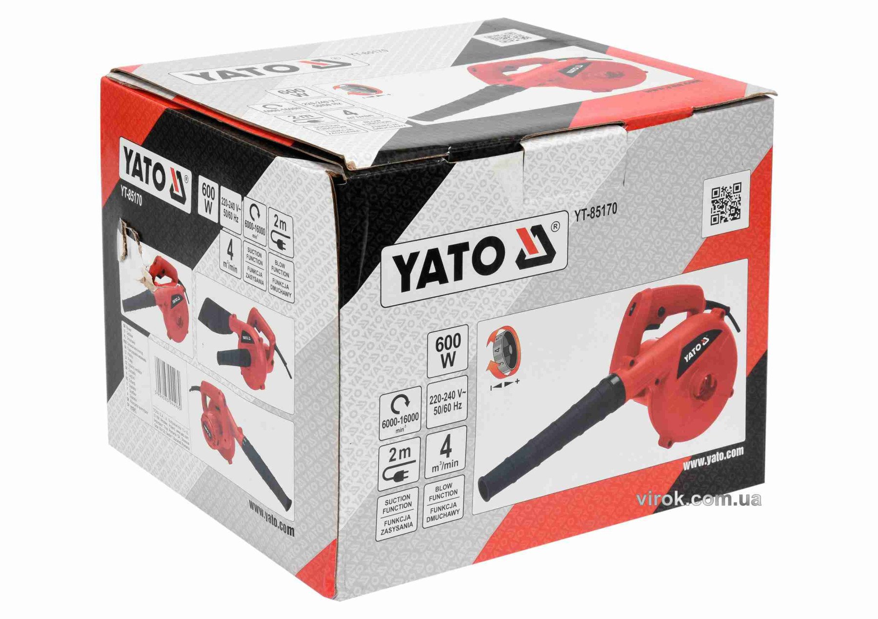 YATO Порохотяг мережевий : 600 Вт, 16000 об/хв, продуктивність- 4 м³/хв, кабель l= 2 м + 2 насадки