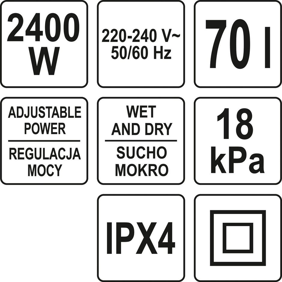 YATO Порохотяг промисловий мережевий : 2400 Вт, збірна ємність- 70 л