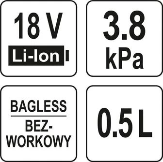 YATO Порохотяг акумулятор.- 18 В: (БЕЗ АКУМУЛЯТОРА), збірна ємність- 0,5 л, 2 подовжув. і насадки