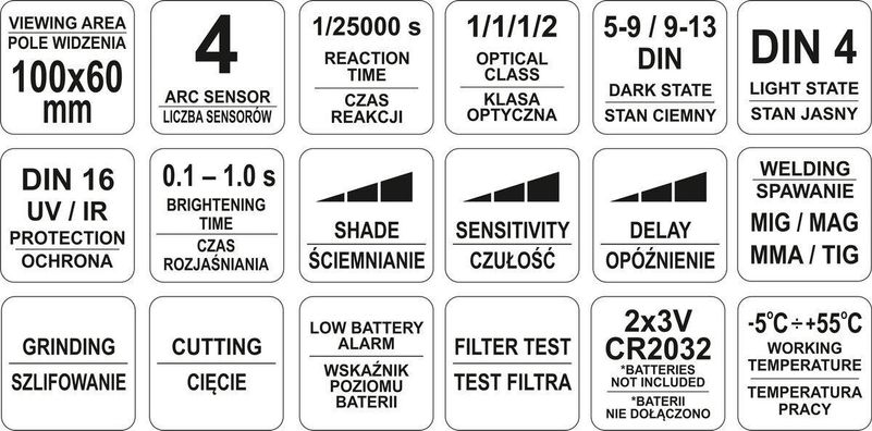 Высококачественная сварочная маска YATO YT-73926 оснащена самозатемняющим фильтром, защищающим от механических и световых факторов. Обеспечивает эффективную защиту зрения на уровне DIN 16 от ультрафиолетовых/ИК-лучей, возникающих при сварке и шлифовании.