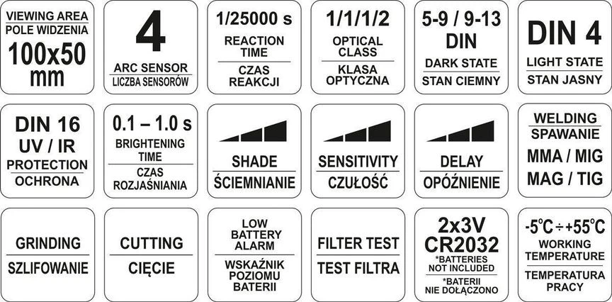 Качественная маска, оснащена фильтром автозатемнения, защищающим от механических и световых факторов. Обеспечивает эффективную защиту глаз на уровне DIN16 от УФ/ИК-лучей, образующихся во время сварки и шлифования.