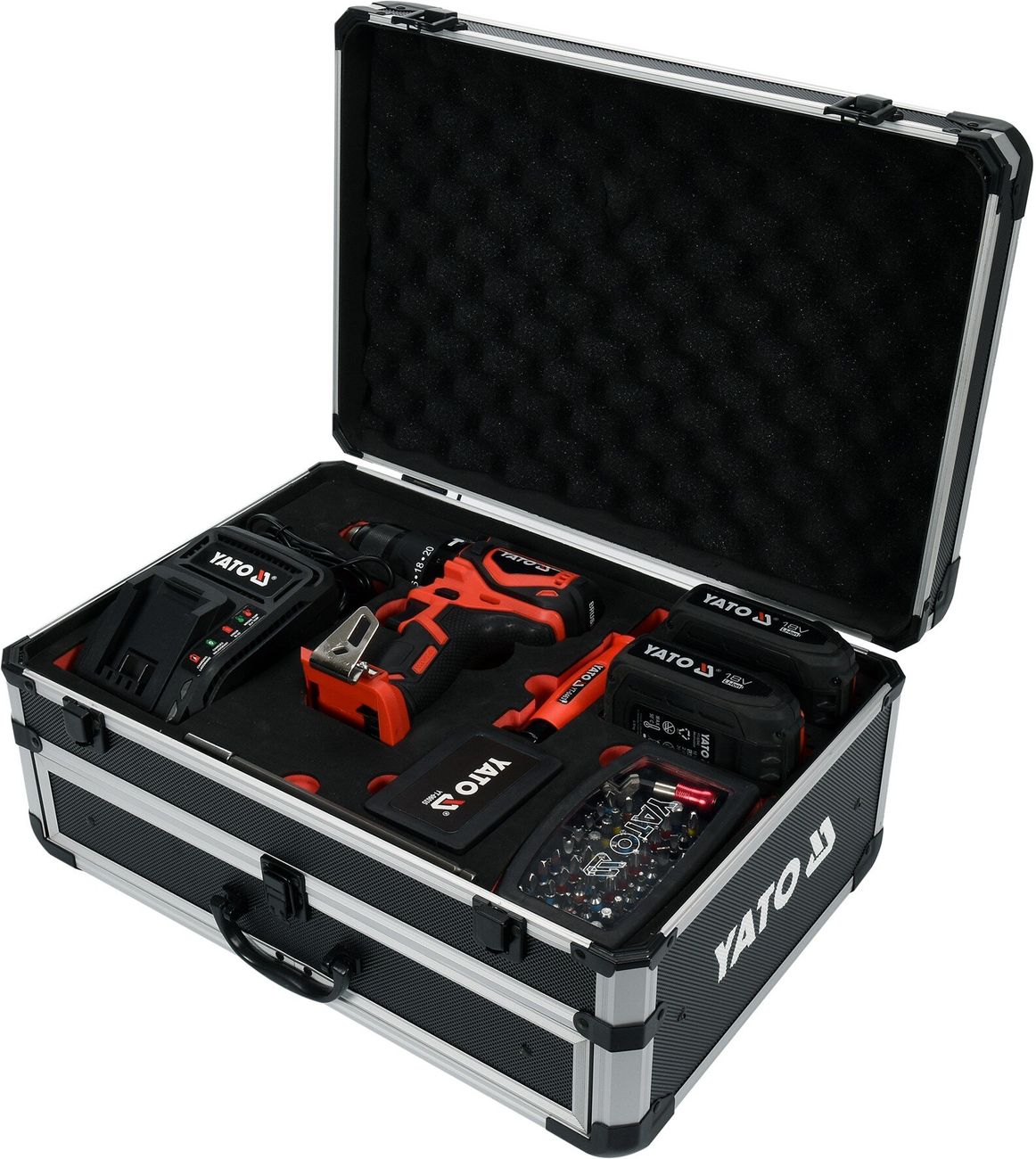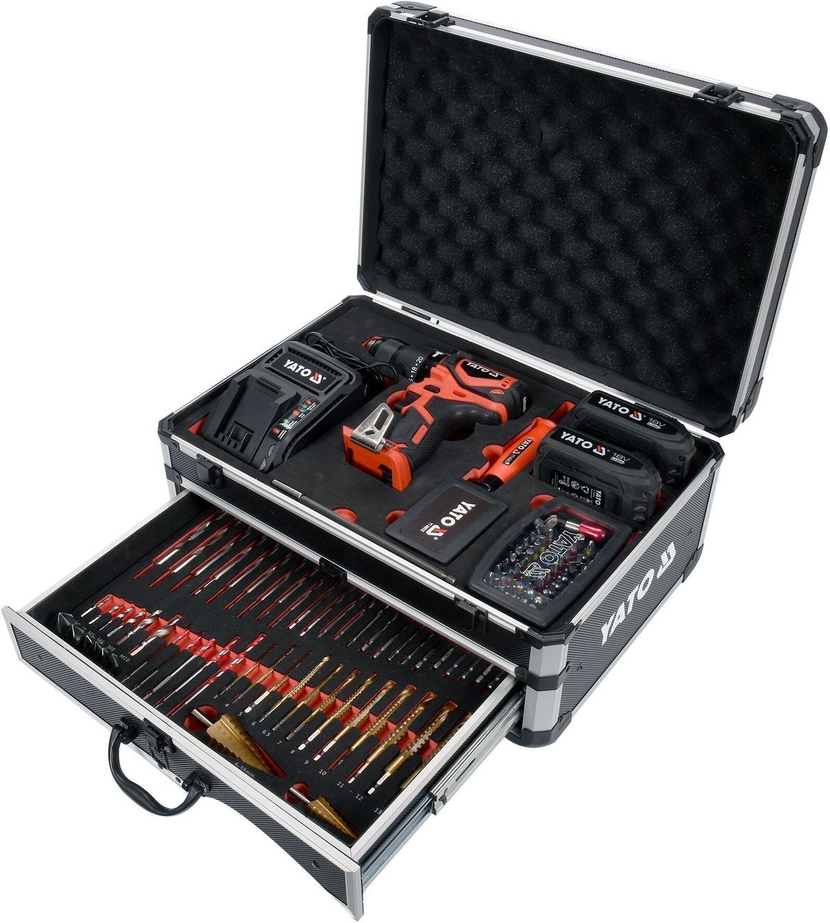 Дриль-шуруповерт з набором свердл і викруткових насадок YATO YT-44250. В наборі 126 різних елементів. Всі вони упаковані в зручний алюмінієвий кейс розміром 450 x 330 x 210 мм.