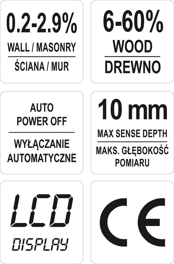 - Діапазон вимірювання: для будівельних матеріалів - 0.2-2.9%, для деревини - 6-60%