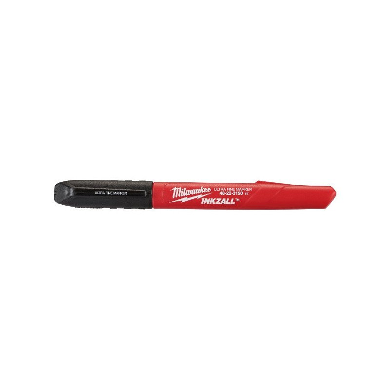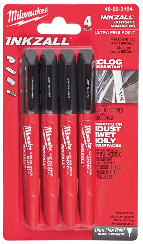 Маркер INKZALL для будмайданчика ультра-тонкий (4шт) особливості: Маркувальні маркери Milwaukee INKZALL Ultra Fine Point оптимізовані для важких умов робочого майданчика. Міцний наконечник спроектований так, щоб витримувати запис на шорстких поверхнях та записувати через запилене, вологе чи масляне забруднення. Кліпса на ковпачку для носіння. Ультратонкий стрижень 0,5 мм для точного запису та маркування. Комплект поставки: Набір маркерів із надтонким пером Milwaukee INKZALL (Чорний) - 4 шт. Постачається в блістері