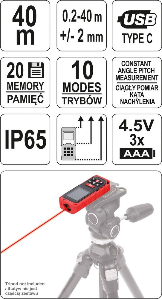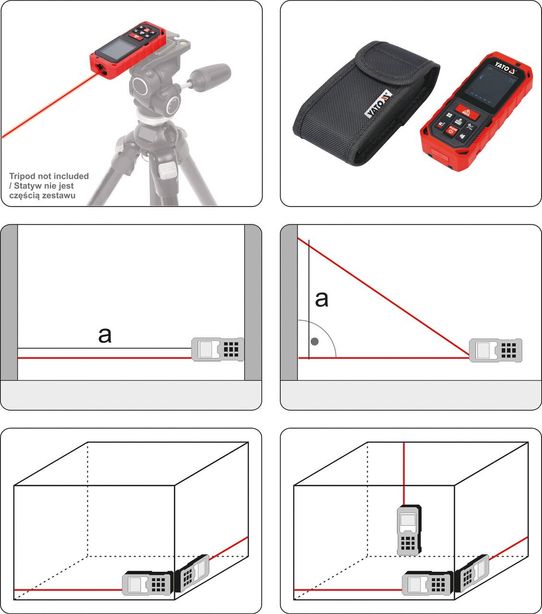 Лазерний далекомір YATO YT-73126 призначений для швидкого та точного вимірювання відстаней в діапазоні від 0.2 до 40 м. Оснащений багатьма функціями (неперервні функції вимірювання, розрахунок поверхні та об'єму, теорема Піфагора, пам'ять з 20 результатів, змінна початкова точка вимірювання, зміна одиниць вимірювання, неперервне вимірювання кута нахилу при вимірюванні відстані). Лазерні далекоміри YATO нового покоління використовуються для професійного застосування в будівництві, промисловості та інших галузях, в яких необхідні швидкі та точні вимірювання.