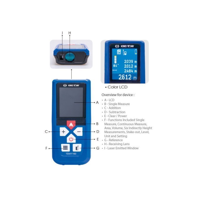 Далекомір лазерний 60 метрів King Tony (7DM1160) – це точний вимірювальний прилад для вимірювання відстаней між об'єктами. Інакше, далекомір називають цифровою рулеткою. За фактом, прилад має значно більший функціонал, ніж рулетка або лінійка: Вміє виконувати одиночний вимір довжини або безперервний. Допомагає швидко обчислити обсяг чи площу. Вбудований калькулятор - виконує додавання, віднімання, переклад між одиницями виміру. Позиціонується вимірювальний прилад використання в автосервісі. Він зручний у проведенні кузовних або монтажних робіт. Завдяки гарному функціоналу, має попит у будівництві, виробництві, меблевій справі. Особливість далекоміра Кінг Тоні у вбудованому 360-градусному датчику. Завдяки йому можна вираховувати відстані у будь-якій площині. Це зручно під час роботи з нестандартними об'єктами або деталями. Існує мікрокомп'ютер, який виконує всі математичні операції без залучення калькулятора. Великий екран з кольоровим зображенням надає інформацію, що цікавить, в режимі реального часу. Технічні характеристики далекоміра King Tony: Діапазон для вимірювання – від 0.05 до 60 метрів (з точністю 0.001 м). Похибка – до 1,5 мм. Пам'ять – на 50 попередніх налаштувань. Живлення - 2хААА батарейки (до 6000 вимірів). Захист – за стандартом IP54. Купити лазерний дальномір Кінг Тоні 7DM1160, Ви можете придбати за низькою ціною.