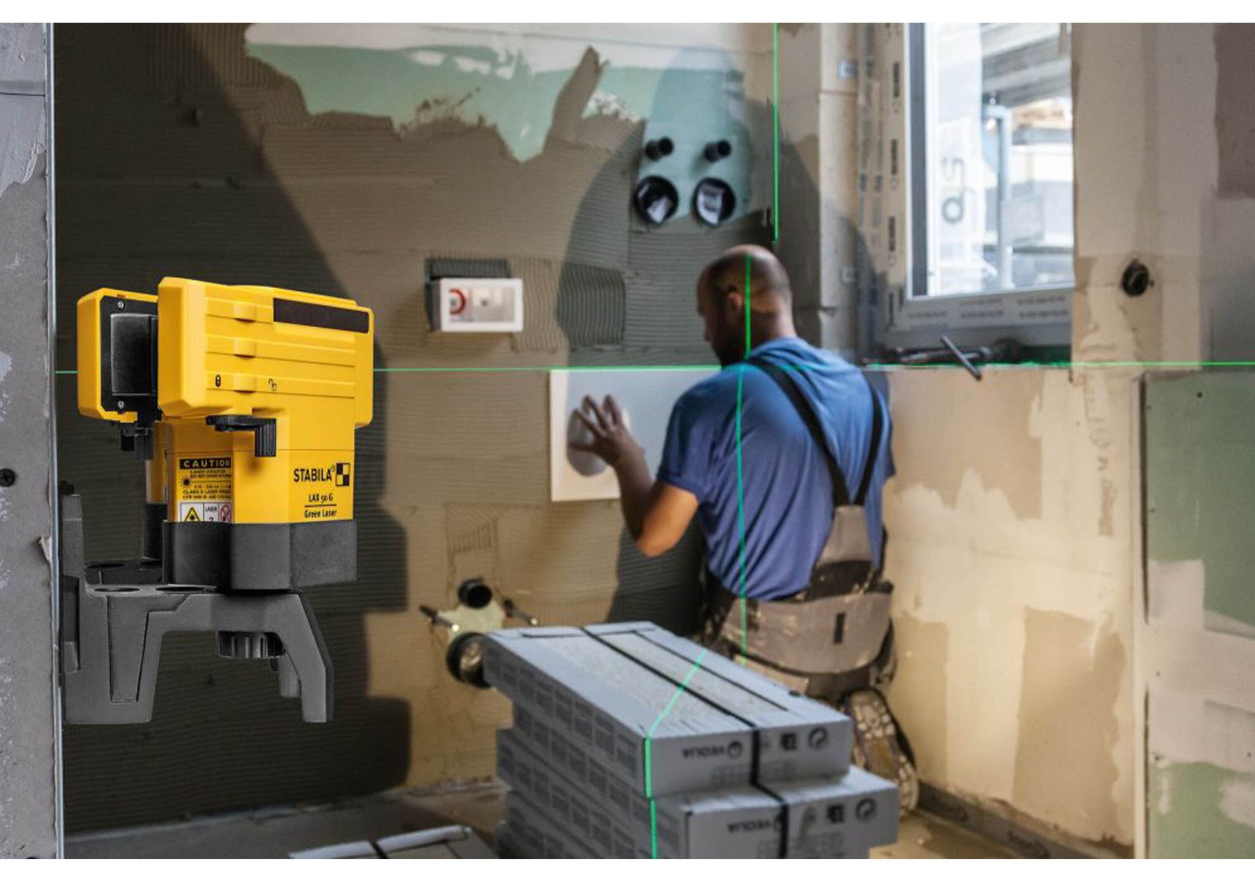 - Самонівелюючий лазерний пристрій з перехресними лініями: надзвичайно яскраві, чіткі, зелені лазерні лінії, оптимально видимі на відстані до 30 м завдяки технології STABILA GREENBEAM