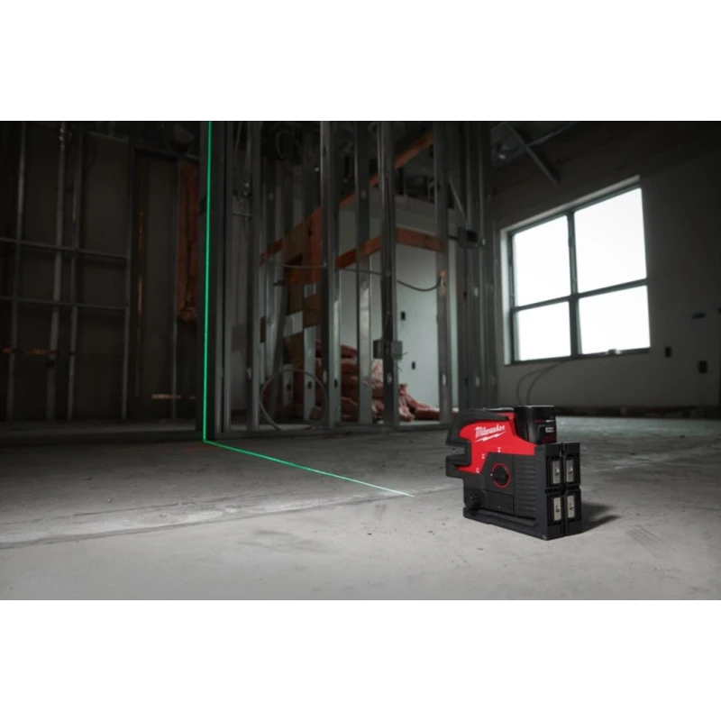 M12™ лінійно-точковий лазерний нівелір із зеленим променем та з 4-ма точками забезпечує універсальну функціональність: горизонтальне та вертикальне вирівнювання, горизонтальне перенесення точок та перенесення точок із підлоги на стелю