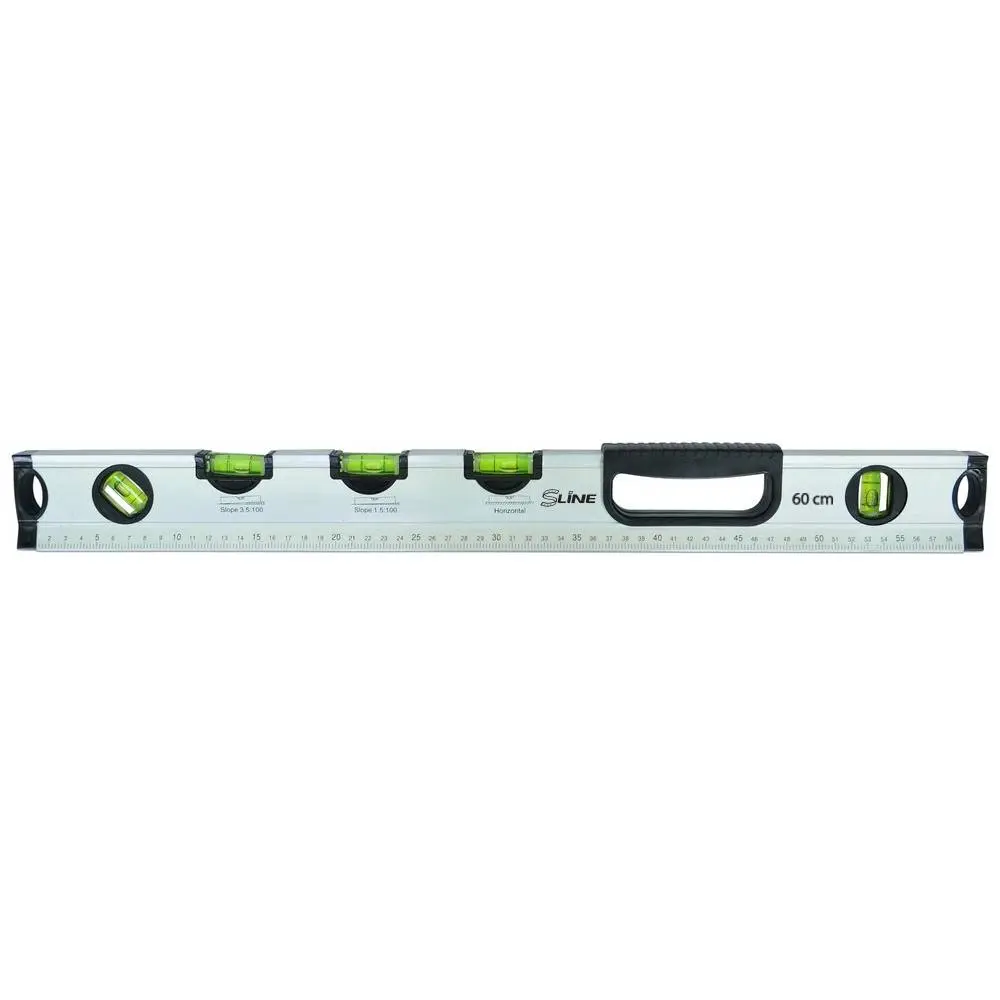 Уровень алюминиевый специальный - это уровень, который изготовлен из высококачественного алюминиевого профиля и имеет 5 глазков для измерения под углами 0 °, 1,5 °, 3,5 °, 45 ° 90 °. На уровнях присутствует отверстие для захвата, что обеспечивает удобную работу с инструментом, комфортный захват инструмента, особенно в труднодоступных местах. Точность уровня составляет 0,057 °. Данный уровень алюминиевый специальный имеет метрическую шкалу с ценой деления в 2 мм. С помощью метрической шкалы, нанесенной на данный инструмент, можно измерить расстояние и использовать его как линейку. Данный уровень дает наибольший спектр измерения: 0 °, 1,5 °, 3,5 °, 45 ° 90 °, отлично подходит для разноплановых работ, особенно для кровельщиков и при монтаже сантехнических труб. Используется для работ с поверхностями с заданным углом наклона.