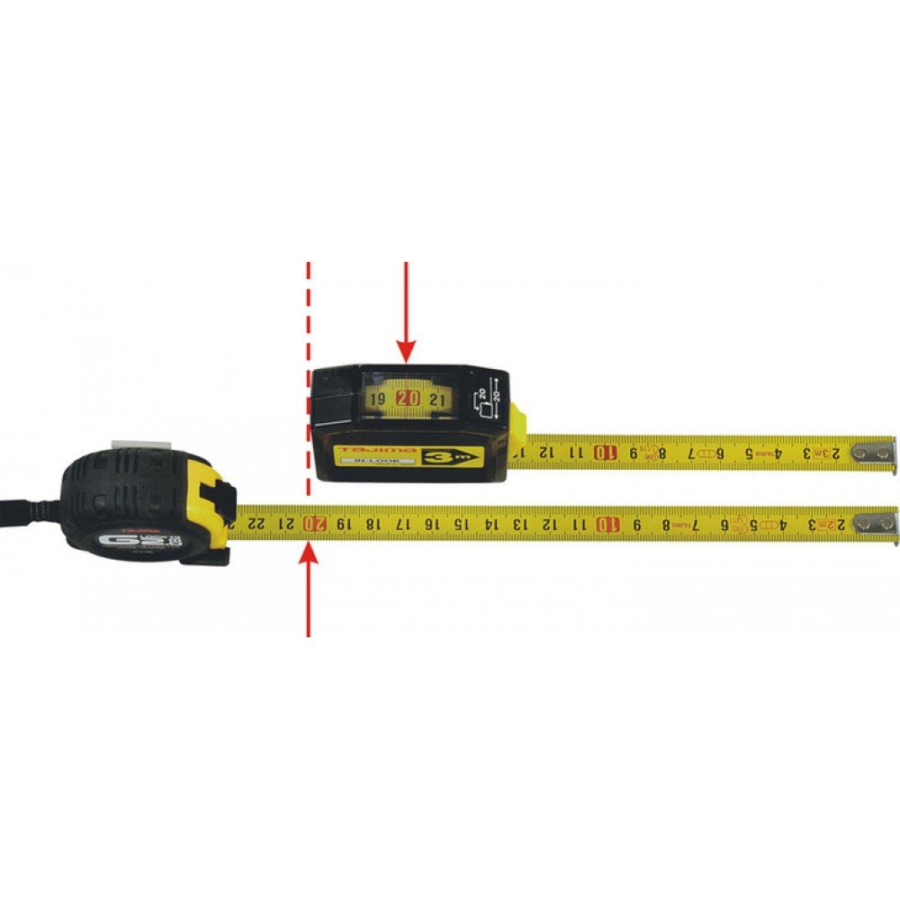 Высокоточная компактная рулетка Tajima со смотровым окошком, в котором отображается длина от концевого захвата до тыльной стороны рулетки.
