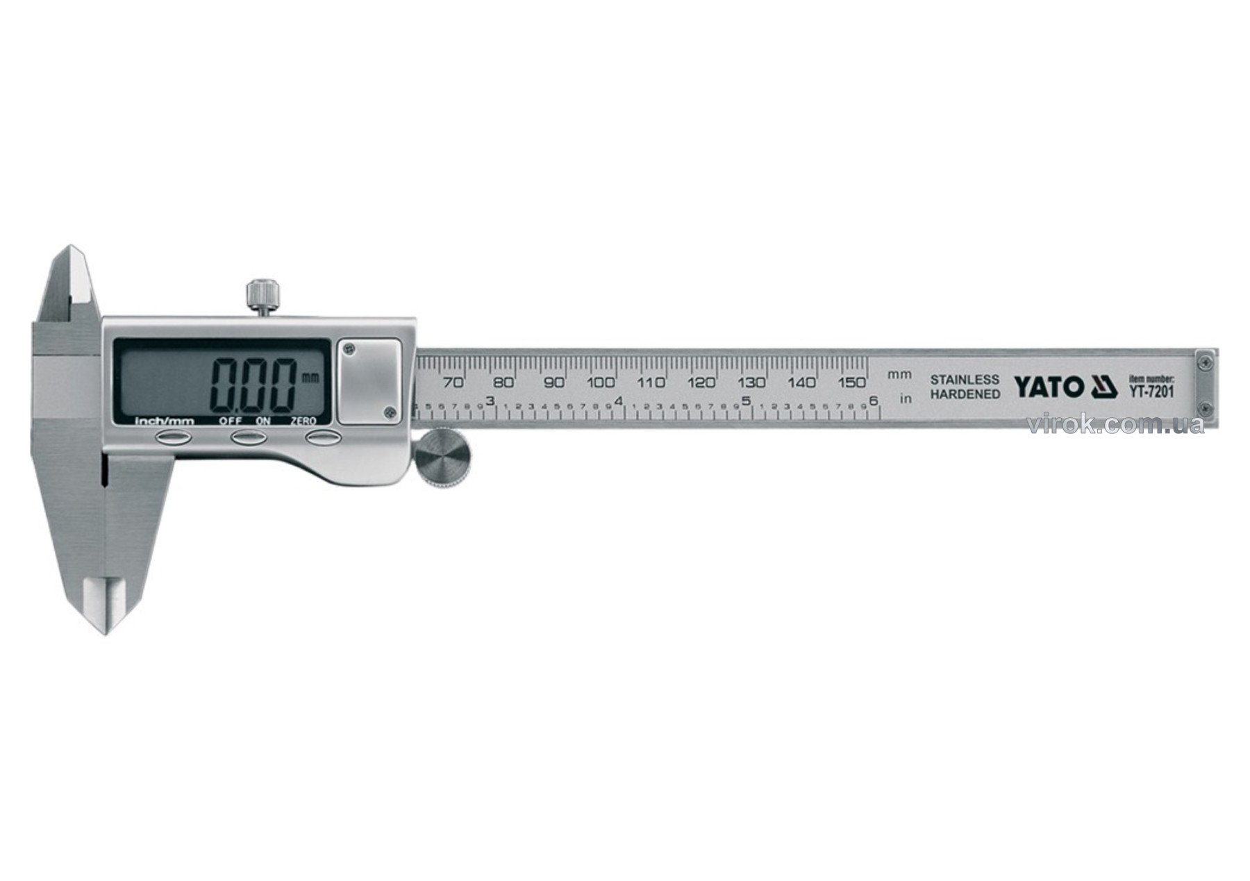 Штангенциркуль YATO YT-7201 – електронний інструмент, який здійснює зовнішнє, внутрішнє вимірювання висоти та глибини. Оснащений РК-дисплеєм. Виготовлений з нержавіючої сталі. Дозволяє виконувати виміри в діапазоні від 0 до 150 мм з точністю 0,02 мм. Шкала адаптована до метричної та дюймової системи. Поставляється в зручному пластиковому кейсі.