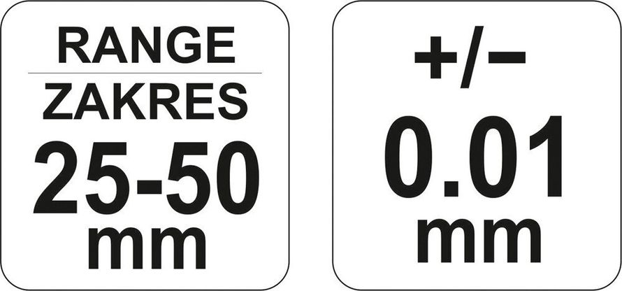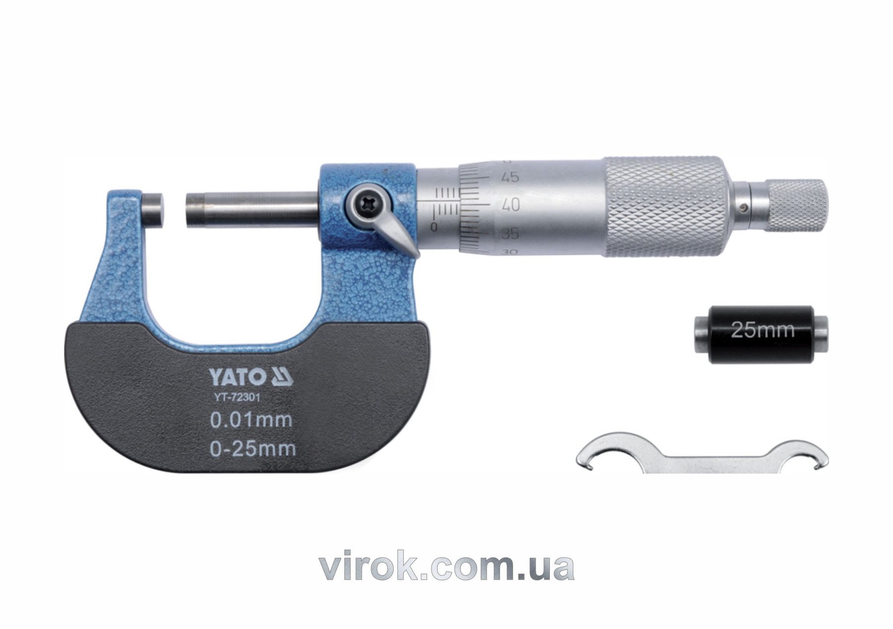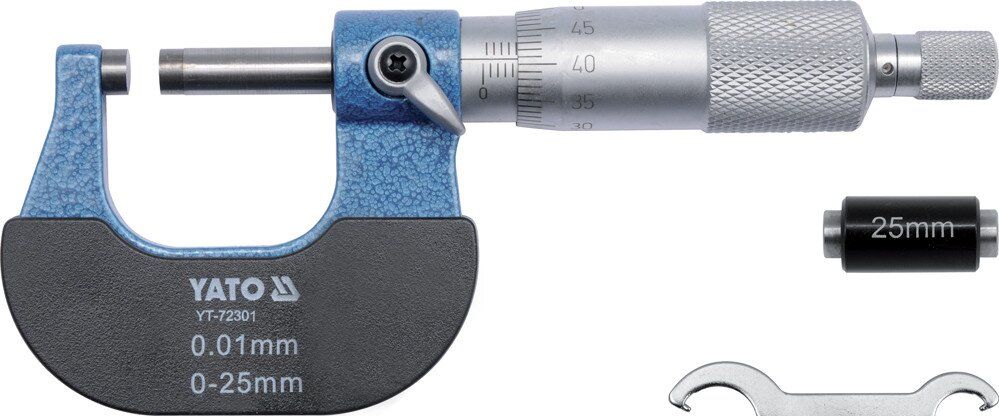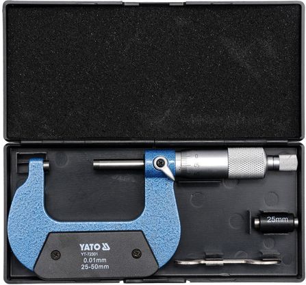 Мікрометр YATO YT-72301 — ручний інструмент, призначений для вимірювання лінійних розмірів деталей в області малих розмірів з високою точністю. Прилад має діапазон вимірювання від 25 до 50 мм, з ціною поділки в 0.01 мм.