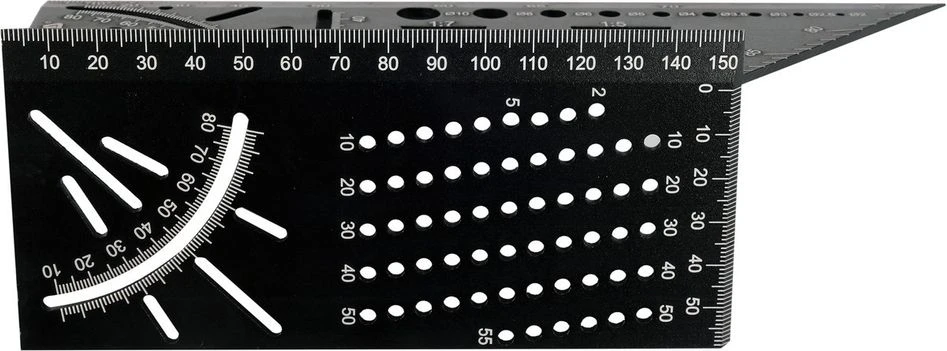 Пространственный угольник YT-70825 предназначен для столярных работ. Изготовлен из алюминия, края имеют миллиметровые деления. Размеры 150 х 70 х 215 мм, толщина 2,8 мм. Угольник включает шаблоны, используемые в столярных работах, например, ласточкин хвост, шаблоны отверстий, транспортир и другие. Обработка поверхности - черный анодированный.
