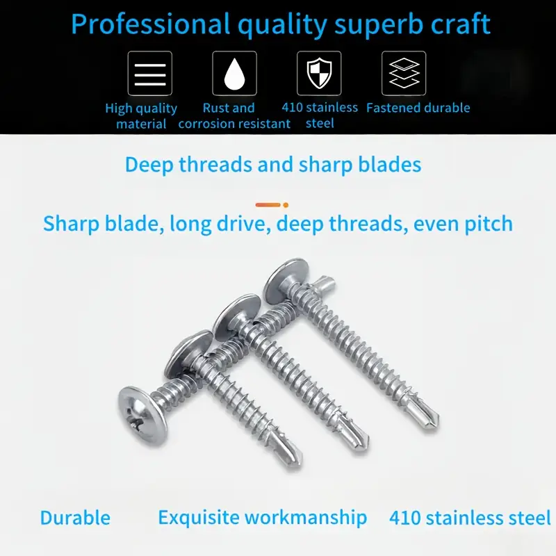 Саморез изготовлен из нержавеющей стали марки AISI 410, оснащён сверловым (самосверлящим) наконечником, полностью резьбой и увеличенной грибовидной головкой с пресс-шайбой. Идеален для монтажных работ, где важны скорость установки, прочность соединения и эстетичный вид головки.