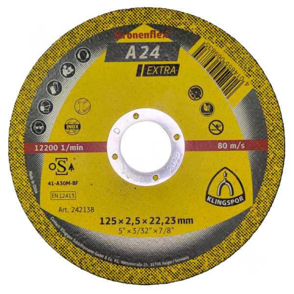 - Маркування А24 Extra метал Зовнішній діаметр 125 мм Підходить для кутова Діаметр посадкового отвору 22,23 мм Товщина 2,5 мм Швидкість різу 80 м/с Допустима швидкість обертання 12 200 об/хв -