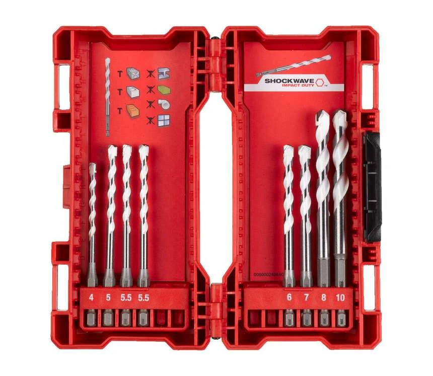 Багатоцільові свердла Milwaukee Shockwave із шестигранним хвостовиком Ударна конструкція: призначена для використання з ударними гайковертами та всіма типами інструментів з 3-кулачковим патроном, таких як дрилі/шуруповерти та ударні дрилі. Асортимент приладдя Shockwave Impact Duty™, призначений для використання з ударними гайковертами, не тільки підходить для складних завдань з високими навантаженнями, але також забезпечує комплексне рішення для всіх користувачів, яким необхідно одночасно свердлити та загвинчувати. Шестигранний хвостовик загальною довжиною до 260 мм, хвостовик з 3 лисками для свердлів загальною довжиною 400 мм. Свердла з наконечниками з карбіду вольфраму (TCT) дозволяють свердлити бетон, цеглу, черепицю, газобетонні блоки, листовий метал, алюміній, м'яку та середню керамічну плитку, всі види дерева та ПВХ. Біла канавка дозволяє користувачеві легко ідентифікувати свердло у ящику для інструментів. Склад комплекту універсальних свердл TCT, 8 шт.: 1x Ø4 x 90 мм 1x Ø5 x 100 мм 2x Ø5,5x100 мм 1x Ø6 x 100 мм 1x Ø7 x 100 мм 1x Ø8 x 120 мм 1x Ø10x120 мм