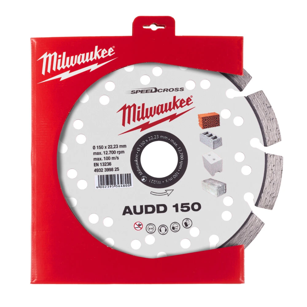 Діамантовий диск AUDD 150 Milwaukee (1 шт) Універсальні алмазні диски для роботи з будь-якими матеріалами Сегменти: 10 мм сегменти забезпечують тривалий термін служби. Велика концентрація алмазної крихти та її спеціальний розподіл на диску забезпечують високу продуктивність. Прецизійне виготовлення диска: Диск виготовляється з прецизійною точністю та піддається термічній обробці, що забезпечує міцність та стійкість його до нагрівання. Охолоджувальні отвори: Забезпечують ефективне охолодження сегментів, що продовжує термін служби диска та дозволяє користувачам працювати довше та швидше у порівнянні зі звичайними дисками. Низький шум: Завдяки ідеальному балансу диска зменшується шум при роботі. Низька вібрація: Спеціальна конструкція знижує коливання диска та зменшує вібрацію під час роботи. AUDD найкраще підходить для роботи з пінобетонними блоками, бетоном, вапняком. Серія AUDD Внутрішній діаметр диска (мм) 22.23 Висота сегмента (мм) 10 Діаметр диска (мм) 150 Ширина різу (мм) 2.6 Гнейс немає Граніт ні Штучний камінь немає Штучний камінь (твердий) немає Керамограніт немає Пінобетон так Порфір немає Черепиця бетонна так Черепиця глина допустимо Шифер допустимо Асфальт немає Базальт так Бетон (м'який) так Бетон (середньої щільності) так Бетон (твердий) допустимо Бетон (армований) допустимо Цегла (м'яка) так Цегла (середньої міцності) немає Цегла (високоміцна) немає Керамічна плитка немає Протон так