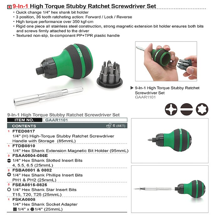 Трещоточная отвертка "мини" 9-в-1 TOPTUL GAAR1101 идеально подходит для работы в ограниченном пространстве.