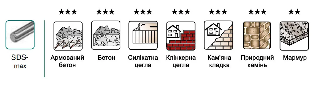 - З утопленою твердосплавною головкою для забезпечення максимальної міцності при влучанні в арматуру, та енергійного просування в бетоні.
