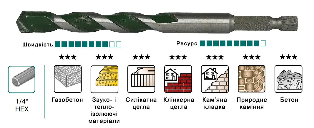 - Можливе свердління навіть гладких і твердих поверхонь завдяки заточеній алмазом поперечній твердосплавній ріжучій кромці.