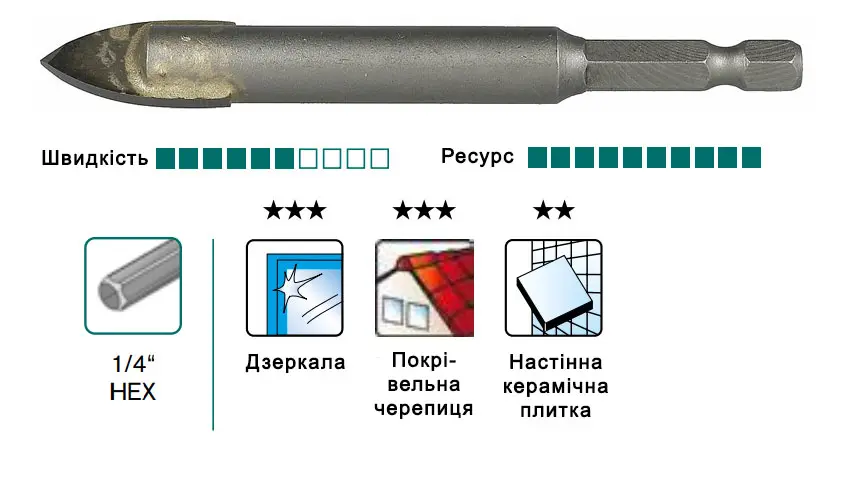 Свердло твердосплавне 6х75 мм QuickBIT CeramicMASTER Heller, скло, кераміка, акрил, черепиця, кахель