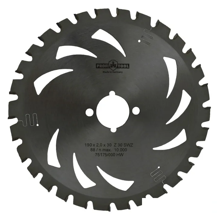 Артикул Діаметр, мм Ширина різання мм Товщина диска, мм Посадка, мм Кількість зубців, шт Форма зубця Бокові отвори 2116002 160 1,8 1,2 20 24 S-WZ 2/5,3/32+3KS 2118402 184 2,0 1,4 30 30 S-WZ 2/7/42+3KS 2119001 190 2,0 1,4 30 30 S-WZ 3KS -