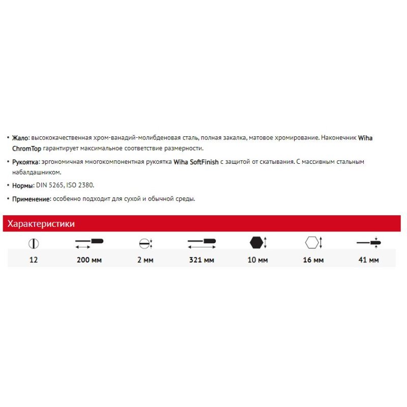 Жало: высококачественная хром-ванадий-молибденовая сталь, полная закалка, матовое хромирование. Наконечник Wiha ChromTop гарантирует максимальное соответствие размерности.
