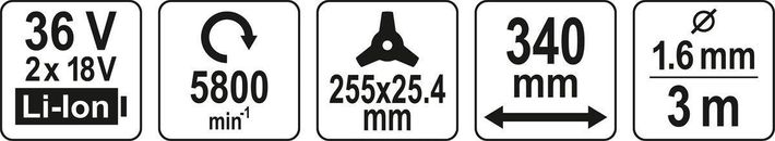 YATO Тример акумуляторний (без акумулятора): Li-Ion 2х18В, 3 Агод, шир покосу- 34 см, жилка Ø=1.6 мм