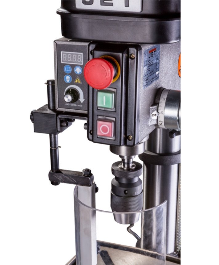 Настільний свердлильний верстат JET IDP-15BV призначений для свердління металів, дерева та навіть пластику. Даний верстат відноситься до класу професійних верстатів і дозволяє свердлити отвори до 16 мм у сталі та до 20 мм у чавуні. Головною особливістю верстата є плавне регулювання швидкості обертання шпинделя, що регулюється від 450 до 2000 оборотів на хвилину. Плавне регулювання забезпечує плата керування. На верстаті встановлений колекторний двигун, обертання на шпиндель передається через шківи і ремінь. Регулювання швидкості здійснюється на лицьовій панелі верстата за допомогою баранчика.