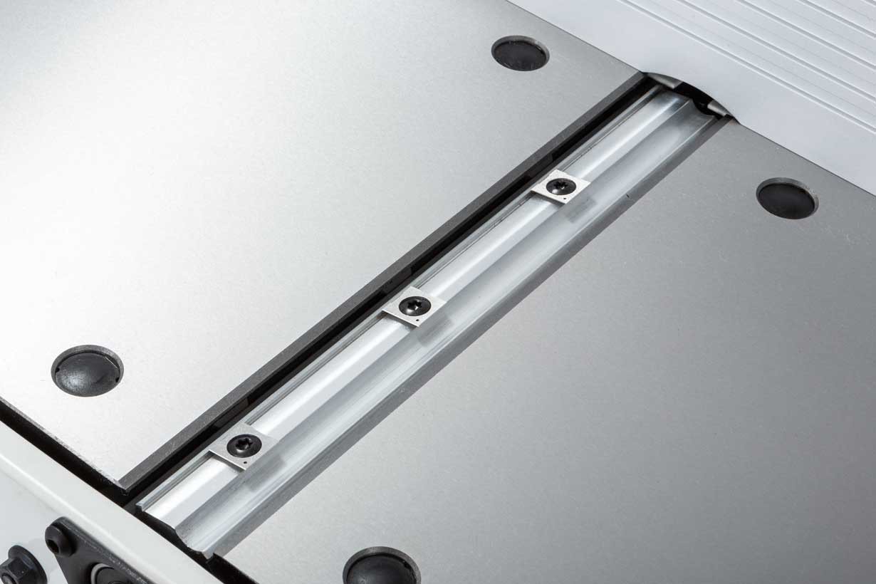А паралельний упор, виготовлений з екструдованого алюмінію, має невеликий виліт і додатково може бути зафіксований кронштейнами, що опціонально поставляються для посилення жорсткості при фугуванні важких довгих заготовок.Висувні подовжувачі збільшують опорну поверхню майже до 1400 мм і мають юстування по площині відносно столів, що подає і приймає.