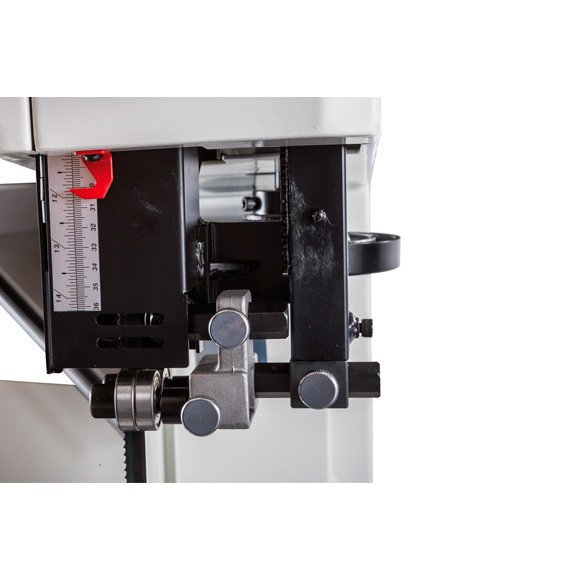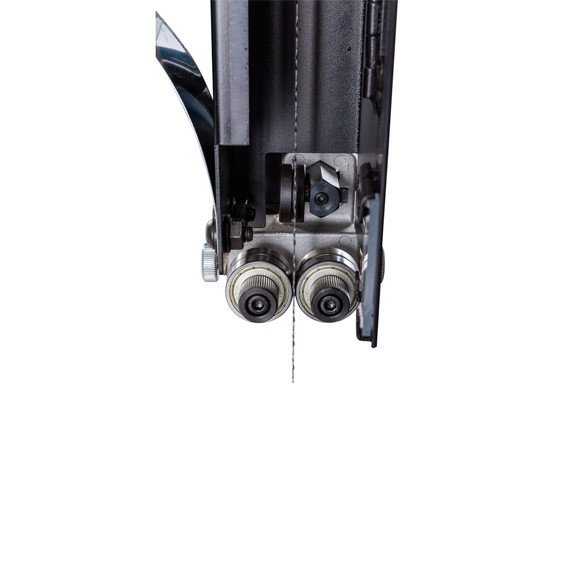 Характеристики Стрічкова пилка JET JWBS-15M (220B) Споживана (вихідна) потужність 1,8 (1,1) кВт Швидкість руху пиляльного полотна 760 м/хв Довжина пиляльного полотна 3380 мм Ширина пиляльного полотна 3-25 мм Діаметр шківів 375 мм Кут нахилу робочого столу -5°-0-45° Максимальна висота заготівлі 356 мм Максимальна ширина заготівлі (просвіт до рами) 360 мм Розміри робочого столу (ДхШ) 405х545 мм Діаметр витяжного штуцера 100 мм Габаритні розміри (ДхШхВ) 810х750х1880 мм Вага 174 кг Особливості: Роликові напрямні пиляльного полотна Трьохпозиційний важіль швидкого натягу та ослаблення пиляльного полотна Регулювання нахилу пиляльного столу обертанням рукоятки Регулювання висоти розпилювання обертанням рукоятки Робочий стіл із чавунного лиття Двопозиційний регульований паралельний упор з мікрорегулюванням Рухливий кутовий упор з напрямною вздовж Т-подібного паза Jet JWBS-15 - стрічкова пилка нового покоління, призначена для професійного використання. Її основна перевага на тлі аналогів минулих поколінь - збільшена висота розпилювання. Цей параметр дуже важливий для тих, кому потрібен універсальний верстат, здатний взяти на себе ділильні функції. До подібних робіт пристосований і паралельний упор: напрямний профіль можна встановити вертикально на бічну грань так, щоб надійно фіксувати плоскі заготівлі при розпуску на тонкі пластини. В цілому конструкція бічного упору дуже добре опрацьована і відповідає найсуворішим вимогам: профіль жорсткий і міцний, закріплений на масивному чавунному кронштейні, який переміщається циліндричною направляючою. Передбачена груба (вручну) та точна (мікрометричним гвинтом) установка. Робочий стіл чавунний, поворотні сегменти, на які він спирається, із цього ж матеріалу. Нахил проводиться за допомогою зубчастого механізму обертанням рукоятки та можливий в обидві сторони (на 5° у бік верстата та на 45° від нього). Для найбільшої ефективності видалення пилу встановлено два 100-міліметрові патрубки: один під робочою поверхнею, другий в нижній частині корпусу. Механізм натягу та центрування стрічки включає дві групи трироликових направляючих на шарикопідшипниках, стрілочний індикатор рівня натягу, регулюючі маховики, два оглядових віконця і важіль швидкого натягу-ослаблення. Він не зовсім звичайний, оскільки має не два, а три фіксовані положення: робоче (щільно натягнуте), для зберігання (стрічка ослаблена, але тримається на шківах) та сервісне (для заміни полотна). Щоб покращити плавність роботи, використано чавунні шківи з масивним тілом, а не у вигляді спицьованих коліс, як раніше. Залежно від типу підключення (одно- чи трифазне) модель маркуються додатковою літерою у назві «М» або «Т» відповідно. Залежно від цього змінюється потужність.