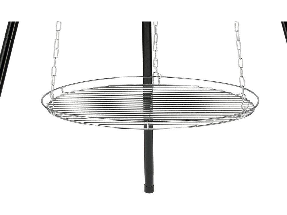 - Хромована решітка легка, міцна, легко чиститься та забезпечує тривалий термін служби. Крім того, решітка має високі бортики, щоб запобігти падінню їжі. Решітку можна підвісити двома способами – на регульованому ланцюгу або на штативі