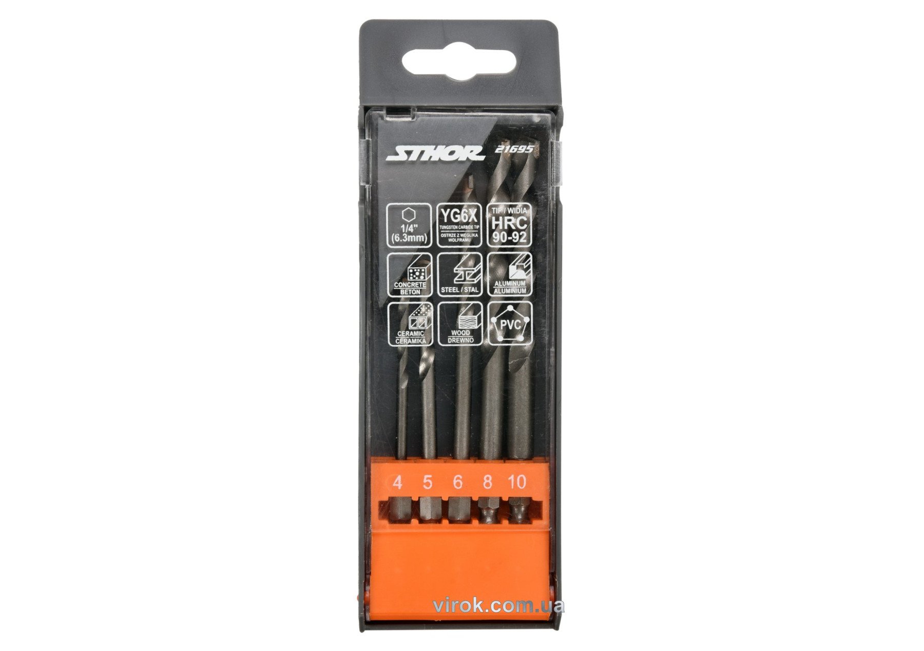 STHOR Набір свердл універсальних : YG6X, з 6-гран. хвостовиком-1/4", Ø= 4, 5, 6, 8, 10 мм, 5 шт | 21695